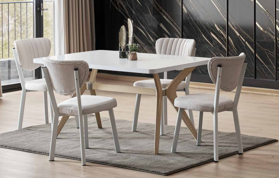 With its versatile design and neutral tones, this dining table complements a range of interiors – from modern to classic settings. Its spacious top comfortably fits multiple seating arrangements, ensuring it’s the centerpiece of your dining area. Whether you’re hosting an intimate dinner or a festive feast, this table is up to the task.